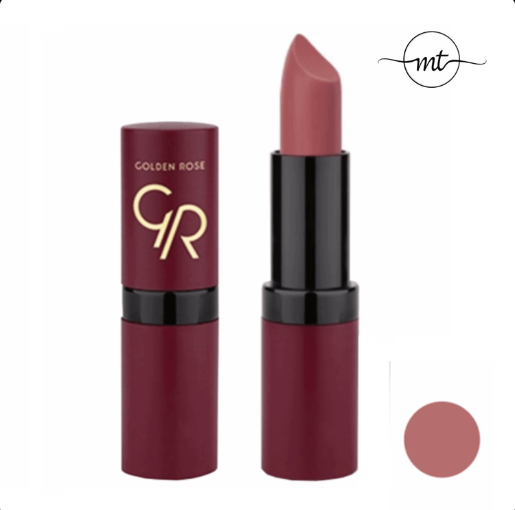رژ لب ولوت مات از برند گلدن رز، دارای نمایی مات و مخملی است و با داشتن رنگدانه های قوی از پوشش و ماندگاری بالایی برخوردار است و روی لب خشک یا لکه نخواهد شد.