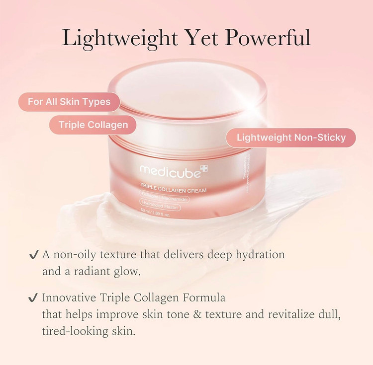 کرم Triple Collagen Cream از برند Medicube، یک کرم پیشرفته است که با فرمولی شامل کلاژن سهگانه، هیالورونیک اسید، نیاسینامید و شیباتر عمل میکند. این کرم با هدف مرطوبرسانی عمیق، افزایش الاستیسیته و سفتی پوست، کاهش لکهها و تیرگیها و تقویت سد محافظتی پوست طراحی شده است.