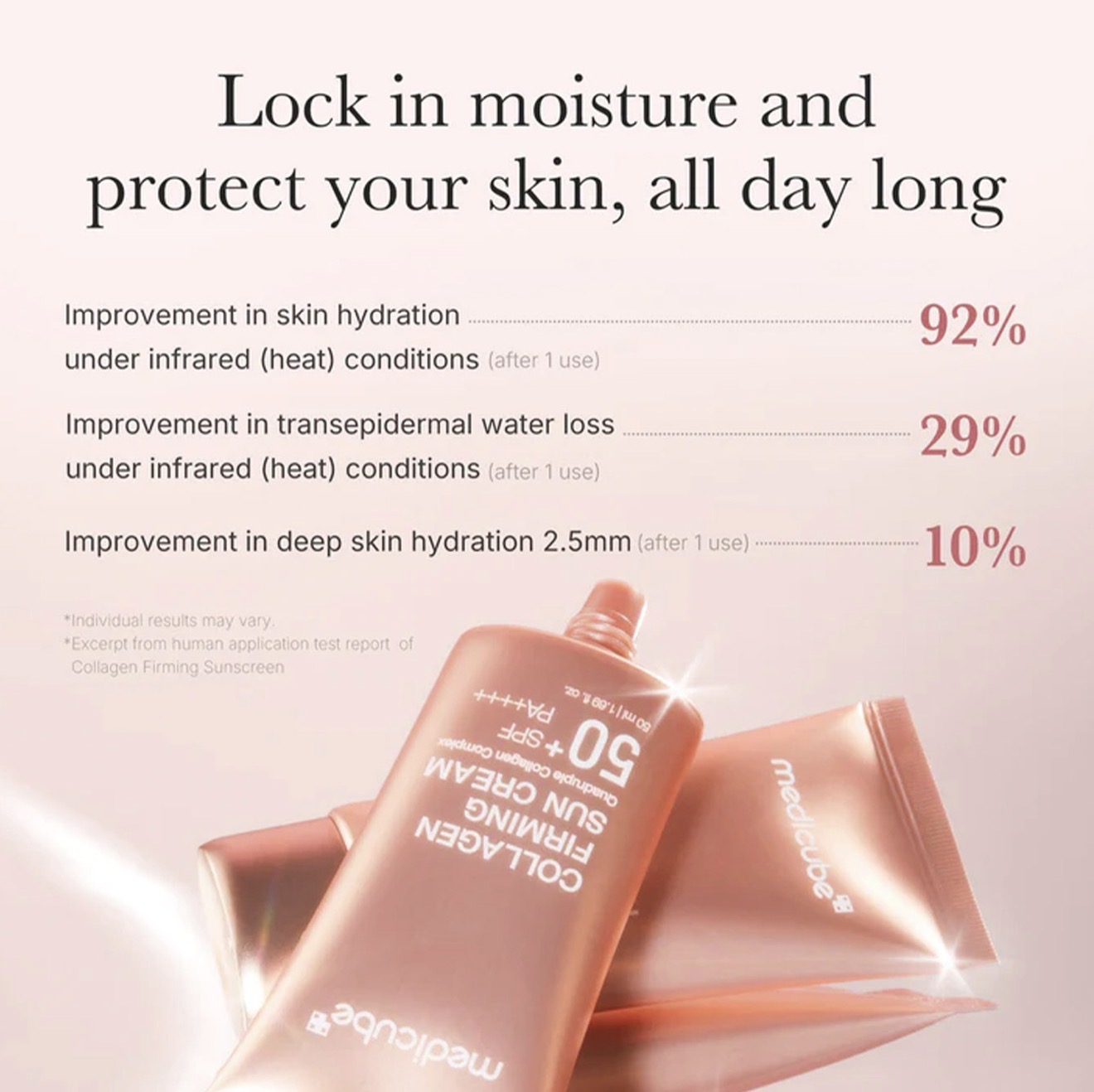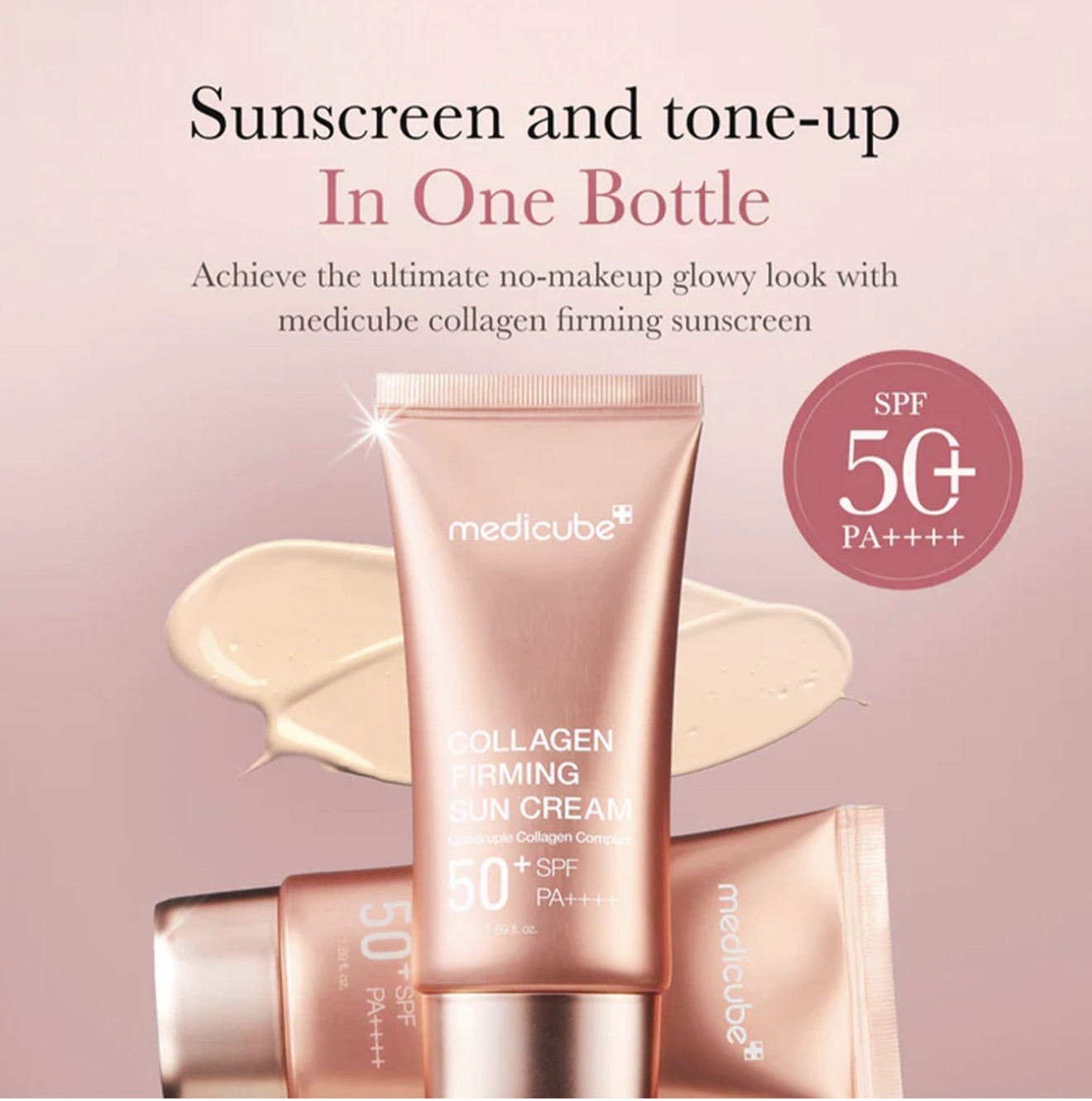 Medicube Collagen Firming Sun Cream SPF50+ PA++++ یک ضدآفتاب چندکاره است که علاوه بر محافظت قوی در برابر آفتاب، خواص مراقبت از پوست را نیز همراه دارد تقویت کلاژن، آبرسانی عمیق و بهبود تُن پوست. این محصول با افزودن چهار نوع کلاژن، کمپلکس آمینو اسیدها، سرامید و هیالورونیک اسید، برای افرادی که هم خواهان محافظت UV و هم بهبود ظاهر پوست هستند، گزینهای عالی است. فرمول آن تُنآپ ملایمی دارد که رنگ طبیعی پوست را بهبود میبخشد و برای استفاده روزانه توصیه شده است.